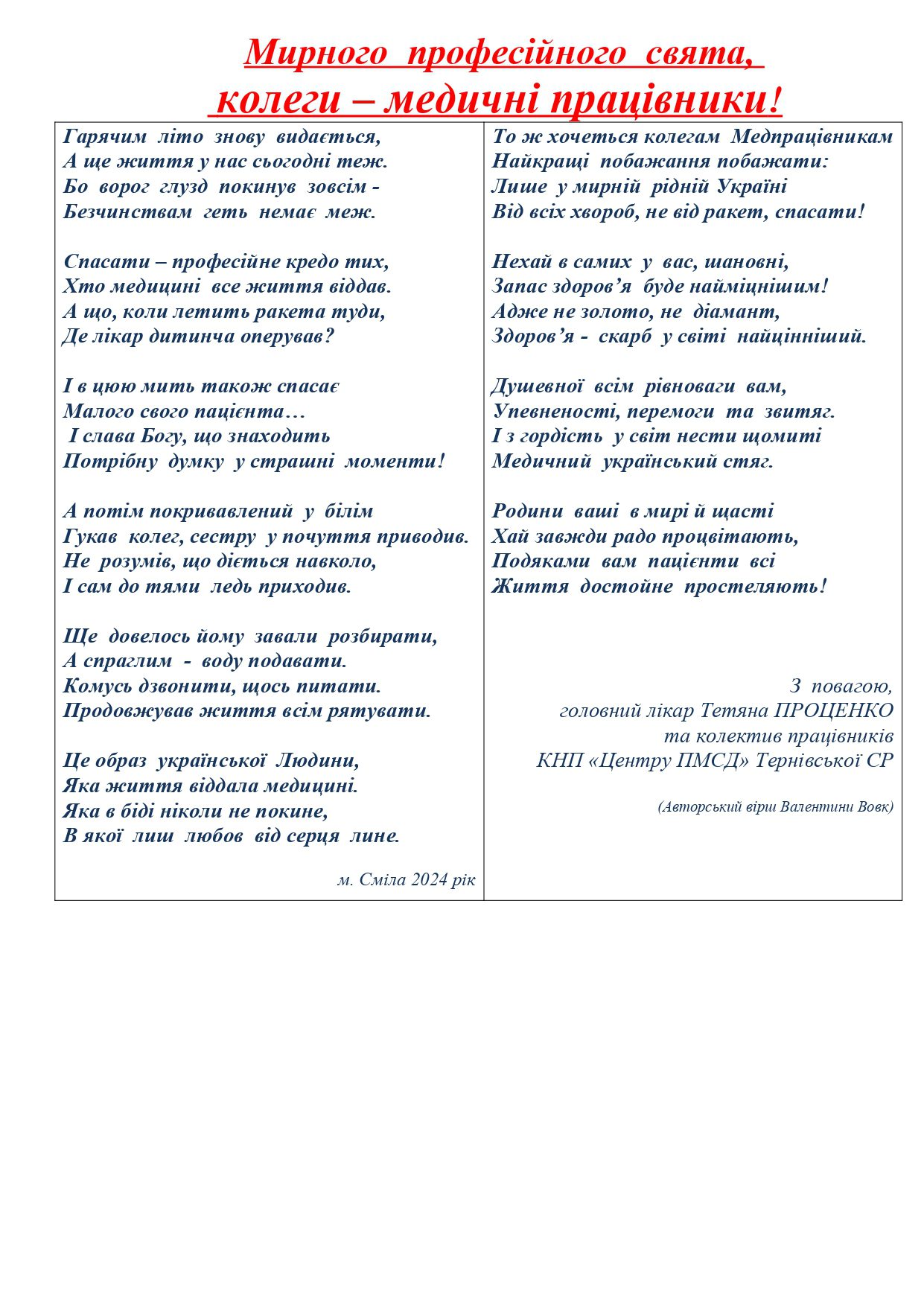 головний лікар Тетяна ПРОЦЕНКО,